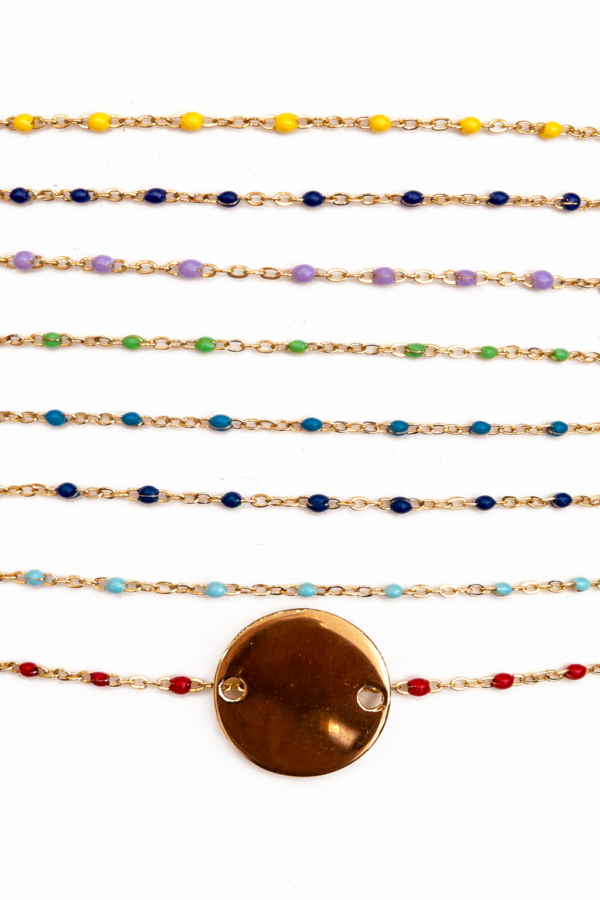 Bracelet mini plaque ronde en plaqué-or est montée sur une chaine avec de l’email de couleur .